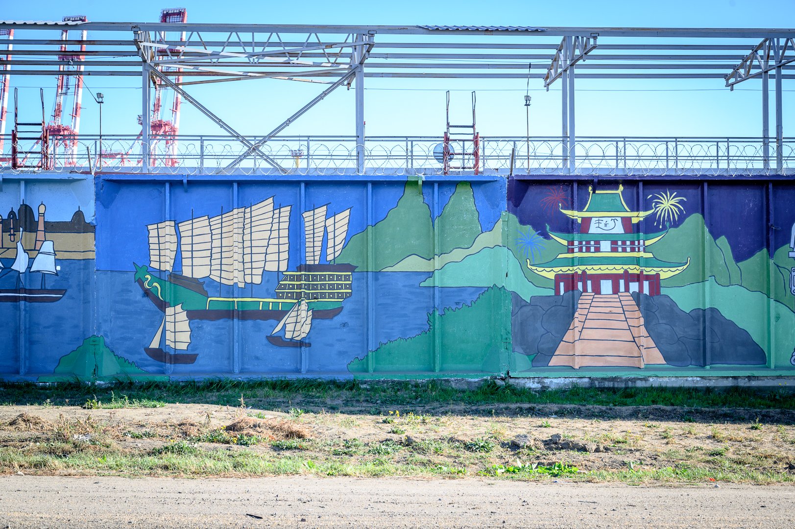 В студии Peach разработали и нанесли контуры масштабного эскиза. На это ушло около двух недель. А затем выступили художниками-наставниками. За мурал принялись, вооружившись кистями и красками взрослые люди серьезных портовых профессий, а также сотрудники железнодорожного управления, терминала ТИС-Уголь. Создание гигантского арт-объекта превратилось в корпоративный праздник.