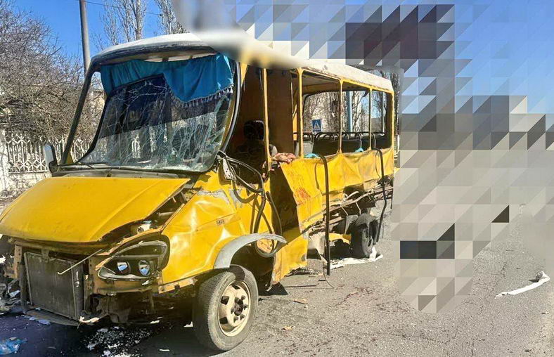 В одному з районів Херсона сьогодні днем російський FPV-дрон під керуванням пілота атакував наповнену пасажирами маршрутку. Внаслідок вибуху транспортний засіб знищено, повідомили в Херсонській ОВА. Станом на 21:00 кількість постраждалих зросла до 20. До однієї з херсонських лікарень доправлено 9 постраждалих: жінки 49, 64, 58, 37, 45, 57 та чоловіки 41, 48, 60 років дістали мінно-вибухові травми. Одна з потерпілих — 58-річна херсонка — у тяжкому стані. У водія 58 років – мінно-вибухова травма та уламкові поранення рук і обличчя.
