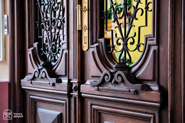 Майстри відновили весь вхідний вузол із глибоким дубовим порталом: оновили завіси, додали дотягувач та електро-ригельний замок, замінили скло, відтворили втрачені декоративні елементи, повернули латунні ручки та латунні накладки в нижній частині дверей. Тепер це знову цілісний простір із правильною глибиною та ритмом.