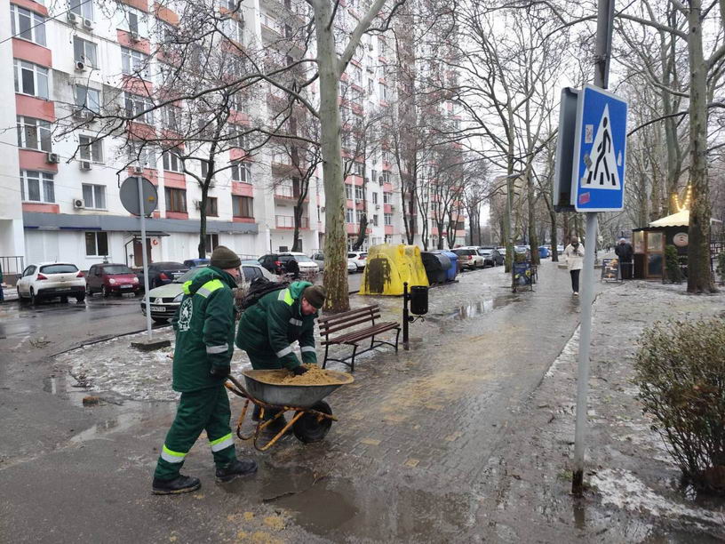 В Одессе посыпали утром тротуары песком для борьбы с гололедицей