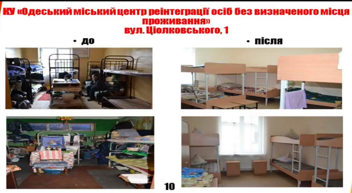 В настоящее время помощь лишённым крова людям в Одессе оказывают коммунальные учреждения «Центр учёта бездомных граждан» (Балтская дорога, 2) и «Центр реинтеграции лиц без определённого места жительства» (на улице Циолковского, 1). Первое учреждение содействует регистрации места проживания и проводит «социальное патрулирование» в городе, а второе оказывает услуги по консультированию, предоставляет койко–места для проживания и юридическую помощь, а также содействует трудоустройству жителей города.