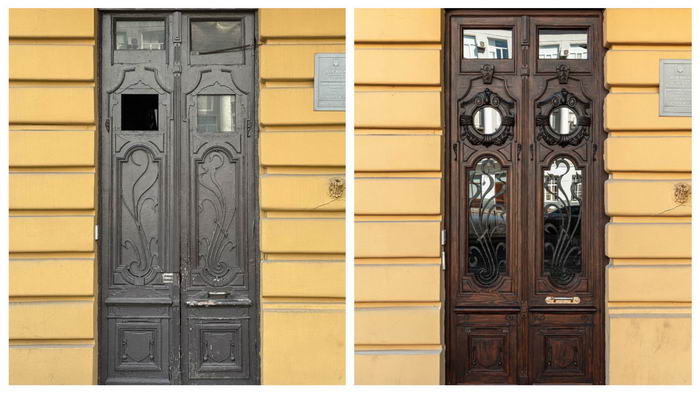Во время реставрации воспроизвели утраченные декоративные элементы, а дерево снова получило глубину фактуры. Резьба читается тактильно – с точностью, с которой работали мастера начала ХХ века. Также реставрированы решетки с клеймом кузнеца «М. Файфель Одесса», обновленная фурнитура, включая занавеси, ручку со стороны подъезда и латунные накладки на каблуки. Установлен качественный доводчик со стопором и электронная система запирания дверей с аккумулятором.